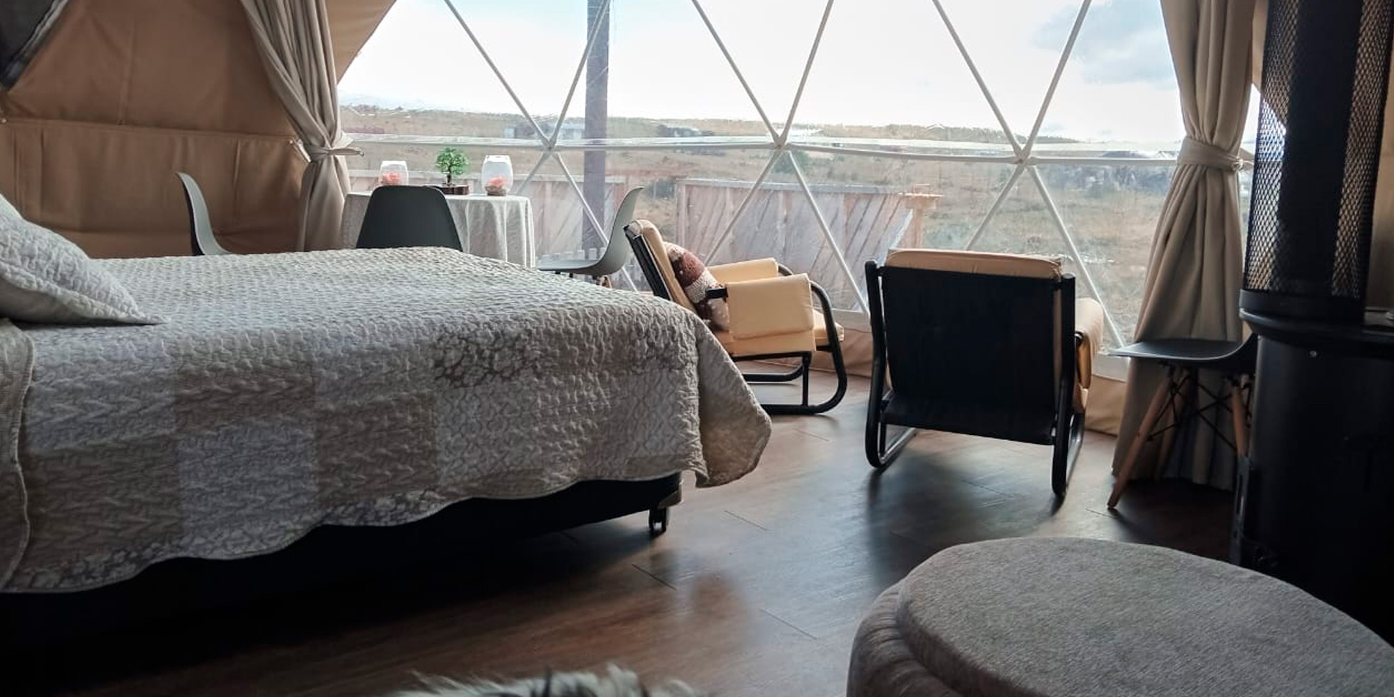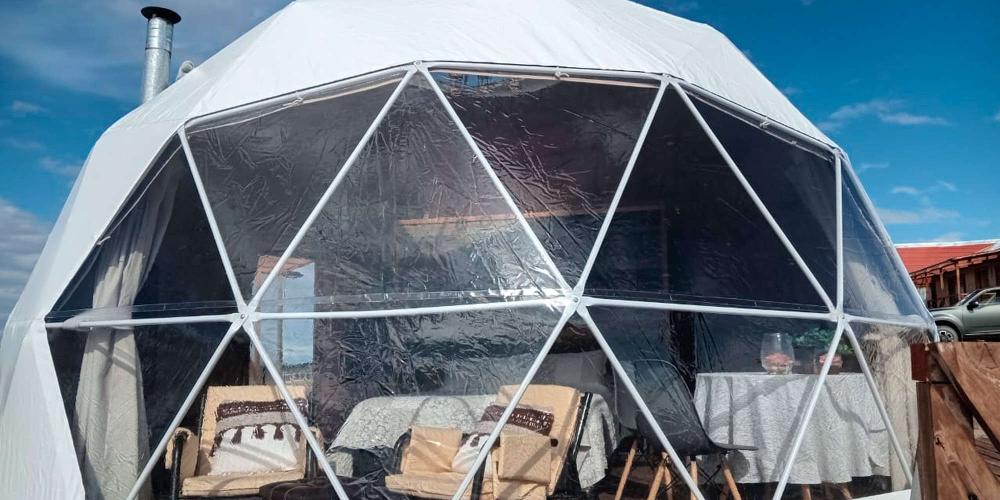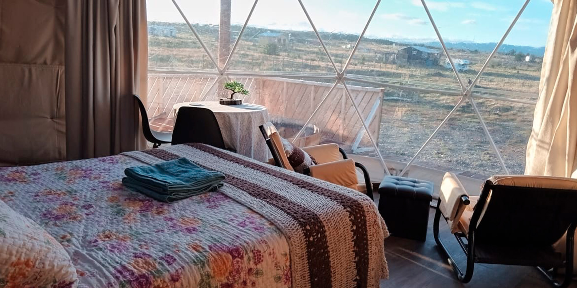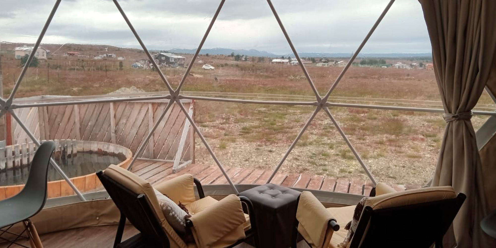 Vive la experiencia de glamping en la Patagonia chilena. Domo calefaccionado con tinaja,  y vistas únicas cerca de Laguna Parrillar. Descubre Glamping Entre Cerros en Magallanes.